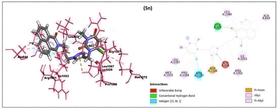 Compound 5n produced a binding affinity of −125 kcal/mol and the corresponding interactions are presented in Figure 9. It produced one conventional hydrogen bond with the target protein. The carbonyl oxygen of the isoquinoline ring formed one hydrogen bond with Leu802 with a bond distance of 1.96 Å. The uracil core is stabilized by a π-alkyl interaction with the amino acid Leu1067. The uracil chlorine atom produced two hydrophobic interactions with the Met1072 and Pro1068 amino acids and it also interacted with the carbonyl backbone of Arg1027. The triazole ring is stabilized by π-anionic interactions with the carboxylic acid group of Asp1028. The isoquinoline ring is anchored by π-alkyl interactions with the amino acids Ile1053, Leu1049 and Ala844.