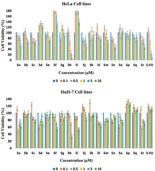 The cytotoxic potency for 5a–r was assayed against HeLa and HUH-7 tumor cells by the standard MTT protocol. The ligands significantly inhibited the proliferation of the selected tumor cells and the corresponding viability profiles are presented in Figure 11.