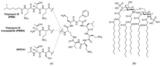 Structures of: (a) polymyxin B (PMB), polymyxin B nonapeptide (PMBN), and SPR741; (b) lipid A component of the Gram-negative lipopolysaccharide (LPS).