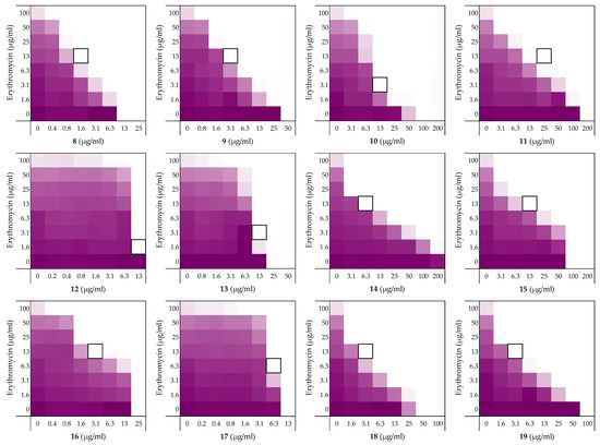 Checkerboard assays of the Ala-scan peptides 8–19 in combination with erythromycin versus E. coli BW25113. In each case the bounded box in the checkerboard assays indicates the combination of peptide and antibiotic resulting in the lowest FICi (see Table 2). OD600 values were measured using a plate reader and transformed to a gradient: purple represents growth, white represents no growth. An overview of all checkerboard assays with erythromycin can be found in the Supplementary data, Figure S1.
