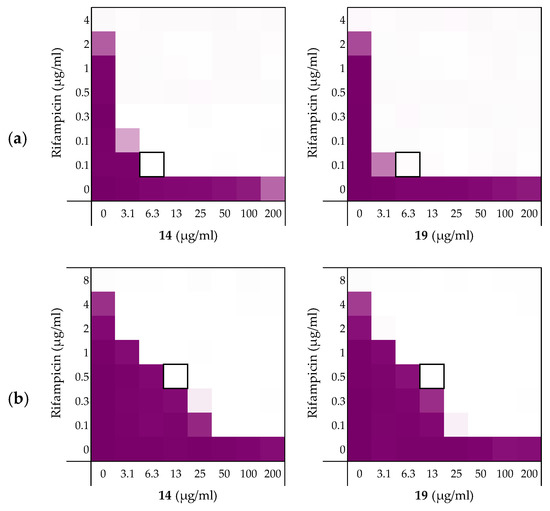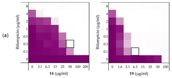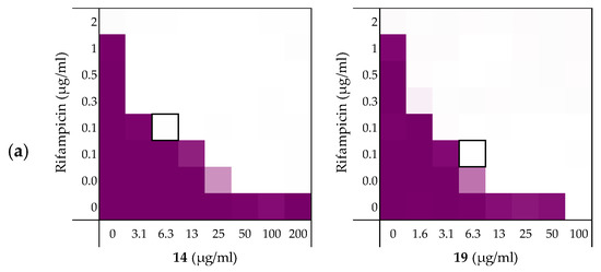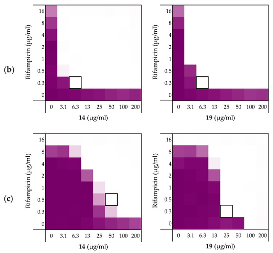 Checkerboard assays for peptides 14 and 19 in combination with rifampicin versus different Gram-negative pathogens: (a) A. baumannii ATCC17978, (b) K. pneumoniae ATCC13883, (c) P. aeruginosa ATCC27853. In each case the bounded box in the checkerboard assays indicates the combination of peptide and antibiotic resulting in the lowest FICi (see Table 5). OD600 values were measured using a plate reader and transformed to a gradient: purple represents growth, white represents no growth. Checkerboard assays of peptides 6 and 10 of the strains shown above are available in the Supplementary data, Figures S13–S15.