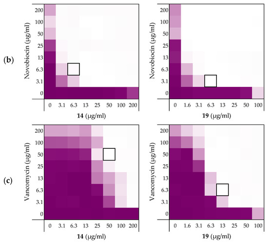 Checkerboard assays of the peptides 14 and 19 in combination with (a) rifampicin; (b) novobiocin; (c) vancomycin versus E. coli BW25113. In each case the bounded box in the checkerboard assays indicates the combination of peptide and antibiotic resulting in the lowest FICi (see Table 3). OD600 values were measured using a plate reader and transformed to a gradient: purple represents growth, white represents no growth. Checkerboard assays of peptide 6, 10, and PMBN in combination with rifampicin, novobiocin and vancomycin are available in the Supplementary data, Figures S2, S5, and S6.