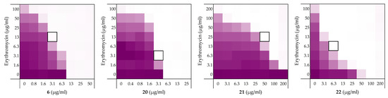 Checkerboard assays of the peptides 6, and stereochemical analogues 20–22 in combination with erythromycin versus E. coli BW25113. In each case the bounded box in the checkerboard assays indicates the combination of peptide and antibiotic resulting in the lowest FICi (see Table 1). OD600 values were measured using a plate reader and transformed to a gradient: purple represents growth, white represents no growth. An overview of all checkerboard assays with erythromycin can be found in the Supplementary data, Figure S1.