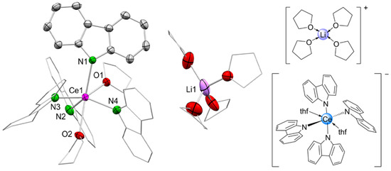 Crystallization from a concentrated THF solution gave 4 as colorless crystals. The crystal structure of 4 revealed a separated ion pair featuring a dicerium dianionic entity (Figure 3). Each cerium center is eight-coordinated and surrounded by three terminal pyrrolato moieties (Ce1–N 2.475(2) to 2.515(2) Å), two bridging pyrrolato ligands connecting the cerium centers in an η1 (Ce1–N4′ 2.622(2) Å) and η5 fashion (Ce1–Ct 2.575(16) Å), and one THF donor molecule. The Ce–N distances are slightly elongated compared with other CeIII ate complexes like [Ce{N(SiHMe2)2}4][Li(do)x] (do, x = py, 4; tmeda, 2; 12-crown-4, 1 and thf, 4; Ce–N 2.377(6) to 2.438(6) Å), KCe[N(SiHMe2)2]4 (2.3820(12) to 2.4379(12) Å), and [Ce{N(SiMe3)2}4][Na(thf)4(Et2O)] (Ce–N 2.434(6) to 2.448(6) Å), due to the higher coordination number CN of 4 (CN 8 vs. 4) [67,68,69]. The σ,π-bridging motif of the pyrrolato ligands has been detected previously, for example, in complexes [Me2In(µ-pyr)]n, [Me2Al2(µ-Cl)](µ-Me4pyr)Li, [Mg{µ-C4H2N(2-CH2NHtBu)}{N(SiMe3)2}]2, and (AlMe3)(µ-C4H3N)[2-CH2NH(tBu)Li(tmeda)] [70,71,72,73].