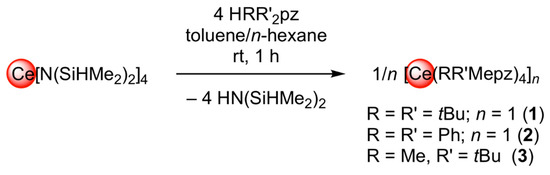 - Schneider, D.; Spallek, T.; Maichle-Mössmer, C.; Törnroos, K.W.; Anwander, R. Cerium Tetrakis(Diisopropylamide)—A Useful Precursor for Cerium(iv) Chemistry. Chem. Commun. 2014, 50, 14763–14766. [Google Scholar] [CrossRef] [PubMed]