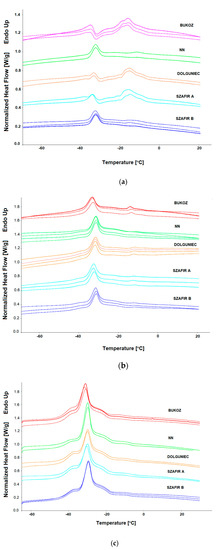 DSC melting curves of cold-pressed flaxseed oils from different cultivars obtained with various heating rates: (a) Heating rate 1 °C/min; (b) Heating rate 2 °C/min; (c) Heating rate 5 °C/min.