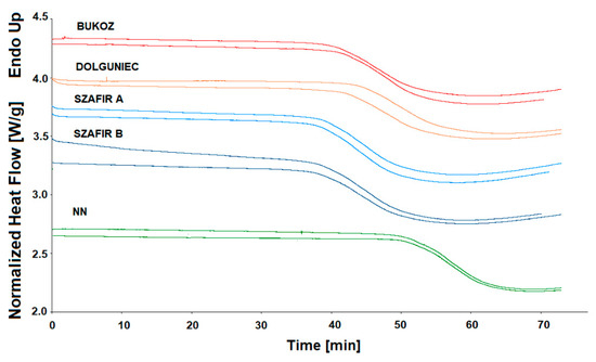 Comparing the shape of curves obtained by scanning rate 1 °C/min, it can be seen that the melting profiles for flaxseed cultivars of Bukoz, Dolguniec and Szafir A are similar, where two peaks, Tm1 and Tm2, are clearly visible. In the case of NN and Szafir B flaxseed oil samples, the huge reduction in the peak Tm2 at around −10 °C was observed.