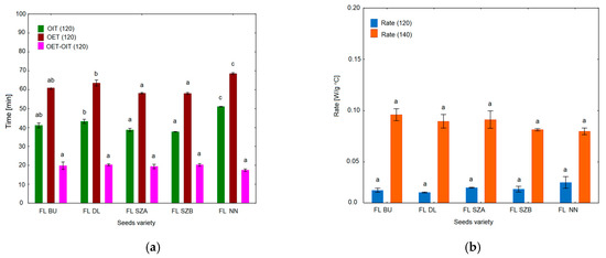 Oxidative stability parameters of five cold-pressed flaxseed oils determined isothermally by DSC at 120 °C: (a) Oxidation induction time OIT (min), oxidation end time OET (min), the oxidation duration Δt (min). (b) Rate of oxidation at 120 and 140 °C. Different letters (a, b, c) indicate significant differences (p < 0.05). FL BU (Bukoz Flaxseed cultivar), FL DL (Dolguniec Flaxseed cultivar), FL SZA, FL SZB (Szafir Flaxseed cultivar), FL NN (Unknown Flaxseed cultivar).