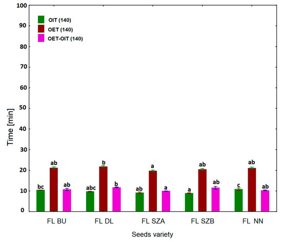 Oxidative stability parameters of five cold-pressed flaxseed oils determined isothermally by DSC at 140 °C: Oxidation induction time OIT (min), oxidation end time OET (min), the oxidation duration Δt (min). Different letters (a, b, c) indicate significant differences (p < 0.05). FL BU (Bukoz Flaxseed cultivar), FL DL (Dolguniec Flaxseed cultivar), FL SZA, FL SZB (Szafir Flaxseed cultivar), FL NN (Unknown Flaxseed cultivar).