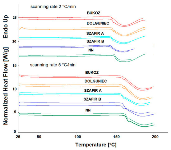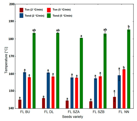 Figure 7 and Figure 8 demonstrate the results of the non-isothermal measurements of thermal stability by DSC of the five samples of flaxseed oils carried out with a scanning rate of 2 and 5 °C/min, for which the values of onset temperature (Ton) and end temperature (Tend) were determined. Considering the scanning rate 2 °C/min, it can be observed that for the Szafir variety (FL SZA, FL SZB), the oxidation initiation temperature (Ton) was the lowest, i.e., 144.5 and 144.1 °C, respectively, while for sample FL NN, the highest value was noted at 146.6 °C. However, all mean values of Ton were not significantly different among the five flaxseed oil varieties. Along with the determination of Ton, Tend values were also collected, which express the end of the oxidation process. As in the case of Ton, for the Szafir variety (FL SZA, FL SZB) the values of Tend were the lowest, i.e., 157.8 and 157.3 °C, respectively, while the highest values were observed for FL BU and FL NN (160.8 and 160.6 °C). However, there were no significant differences between the mean values of Ton and Tend among the five oils at a scanning rate of 2 °C/min. The oxidative behavior of oils under increasing temperature was further tested for a higher heating rate, i.e., 5 °C/min (Figure 7 and Figure 8). The determination of onset time (Ton) for rate 5 °C/min confirmed the best stability of the sample of FL NN, reaching the highest level and significantly different from the remaining four oils at a value of 162.50 °C (p < 0.05). The Ton values for the remaining oils ranged between 157.7 and 158.5 °C and they do not differ significantly. Similarly, the parameter of the end of oxidation (Tend) was highest and significantly different for FL NN. Summing up, the non-isothermal DSC technique showed that the Szafir seed variety was oxidized at the lowest temperatures for both 2 and 5 °C/min, along with the highest values for the sample FL NN variety, indicating significantly higher resistance to oxidation than for other varieties in both cases of rate.
