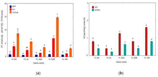 Oxidative stability parameters of five cold-pressed flaxseed oils: (a) Peroxide value (PV), p-anisidine value (pAV), total oxidation rate (TOTOX) value; (b) Acid value (AV), acidity. Different superscript letters (a, b, c, d) indicate significant differences (p < 0.05). FL BU (Bukoz Flaxseed cultivar), FL DL (Dolguniec Flaxseed cultivar), FL SZA, FL SZB (Szafir Flaxseed cultivar), FL NN (Unknown Flaxseed cultivar).