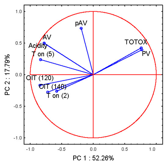In order to explain the variation in thermal resistance to oxidation among the cultivars, correlation analysis between fatty acid composition and DSC isothermal and non-isothermal results was performed, the results of which are presented in Table 7. As can be seen, high Pearson’s correlation coefficients were obtained between fatty acid C18:3 and all DSC parameters, except for the parameter of non-isothermally measured onset temperature (Ton) at the scanning rate of 2 °C/min. It can be concluded that α-linolenic acid is predominantly responsible for the thermal oxidation of flaxseed oil. This statement is in agreement with the findings of other researchers [28]. In order to establish the relations between thermo-oxidative stability and stability determined by chemical methods, principal component analysis was performed. This is a method for detecting structure in the relationships between variables and to classify the objects [29]. Principal component analysis (PCA) was used to describe the oxidative stability of flaxseed oil measured by different methods. Various variables were used for PCA: from isothermal DSC oxidation determination at 120 and 140 °C: OIT(120), OIT(140) and non-isothermal onset temperature at a heating rate of 2 and 5 °C/min: Ton (2), Ton (5), as well as from the chemical determination of oxidation stability: PV, pAV, AV, acidity, TOTOX. Using the graphical criterion, the first six principal components, which explain 99.85% of the total variance, were derived. Figure 10 depicts the plot of loadings, which visualizes relations between variables by analyzing the first two principal components: PC1 and PC2. The horizontal axis corresponds to PC1, and the vertical to PC2. The closer the variable is to the circle, the more it is correlated with the component. The graph obtained shows that the first two PCs describe 70.05% of the initial variability, where the first PC1 explains the observed variability in 52.26% and PC2 in 17.79%. The first component (PC1) describes the thermo-oxidative stability measured by parameters such as OIT (120), OIT (140) and Ton (2), Ton (5), as well as PV and TOTOX. The first PC is positively correlated with PV and TOTOX, and negatively correlated with the rest of the variables, which were taken for the analysis, except pAV. From all sets of DSC variables which are related to PC1, with all being located on the negative side (negative correlations with PC1), the strongest factor loadings were noted for OIT (120), being −0.85, and for Ton (5) of −0.84. On the opposite side of PC1, the variables of PV and TOTOX are located, which means that there are negative correlations between them and DSC parameters. This observation confirms that the greater the peroxide value, the lower the DSC parameters, i.e., the lower the thermo-oxidative stability. However, it can also be seen that variables of PV and TOTOX are strongly related to PC1 (0.69 and 0.68, respectively), as well as to PC2 (0.56 and 0.58, respectively). Figure 10 also shows no correlation of DSC parameters with anisidine value (pAV), as they are located perpendicular to each other, thus the pAV variable is more related to PC2 with a factor loading of 0.73.