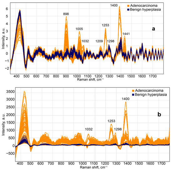 Preprocessed Raman spectra, using spectrum smoothing, background subtraction, and normalization (a) and the same combination of methods without normalization (b) from the regions of acinar adenocarcinoma and benign hyperplasia in prostatic tissue, produced by laser excitation of 785 nm wavelength.