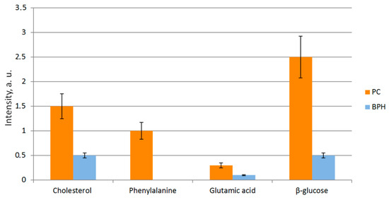 Relative intensities of Raman shifts, with error bars denoting several substances identified in PC and BPH samples. Level «0» corresponds to the level of noise in the spectrometer, which does not allow detecting signals that are lower in intensity than these noises.