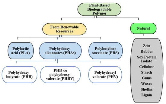 Plant-based biodegradable polymers can be categorized into two groups based on their availability: (1) natural plant polymers: Plants produce a number of natural polymers such as rubber (cis-1,4-polyisoprene), cellulose, starch, gluten (glutenin and gliadin), zein, soy protein isolate, gums, etc., and (2) from renewable resources: These polymers are derived from natural resources via processing, such as fermentation, ring opening polymerisation, etc., to form poly lactic acid (PLA), poly hydroxyl kanoates (PHAs), poly hydroxy butyrate (PHB), etc. It is also worthwhile to note that fossil sources can also be used to derive biodegradable polymers such as polybutylene adipate terephthalate (PBAT) and polycaprolactone (PCL); however, their discussion is beyond the scope of this review, and therefore, their properties and applications have not been discussed in this article.