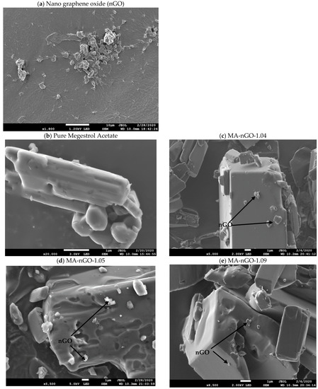 Scanning Electron Microscope (SEM) images of (a) nano graphene oxide, (b) pure megestrol acetate, (c) MA-nGO-1.04, (d) MA-nGO-1.05, and (e) MA-nGO-1.09.