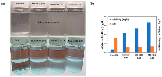 (a) Photograph of MA-nGO composites 24-hour solubility in water (upper) and octanol-water partitioning (lower). (b) Water solubility and octanol-water partitioning coefficient (logP) of MA-nGO composites.