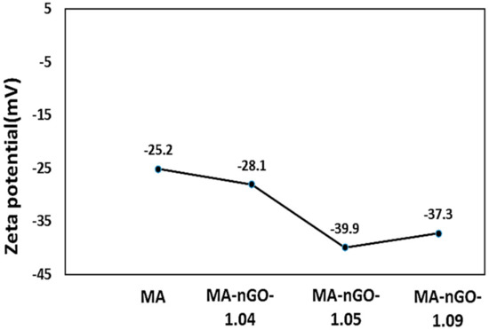 Zeta potential measurements by Zetasizer instrumentation were used to measure surface charge of MA-nGO composites. The observed data presented in Figure 5 shows an increase in negative zeta potential values for all the MA-nGO composites, which demonstrates its higher colloidal stability compared to pure MA. The MA-nGO with lower nGO incorporation (~1.05% concentration) showed the highest stability −39.9 mV due to the uniform distribution of nGO.