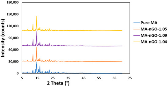 Figure 6 shows the Raman spectrum of pure MA and MA-nGO composites with various nGO incorporated concentrations. The D-band region at 1340 cm−1 and G band at 1580 cm−1 from graphene oxide overlapped with peaks from MA drug. The spectral position of the other peaks in MA did not change. The strong spectral intensity peak for all the drug composites for different frequency regions suggests the prepared composite has unchanged crystalline structure. XRD was also carried out for crystal structure determination. X-ray powder diffraction (Figure 7) confirmed that the crystal structure of pure MA and the MA-nGO composites were similar and that there was no change in polymorph.