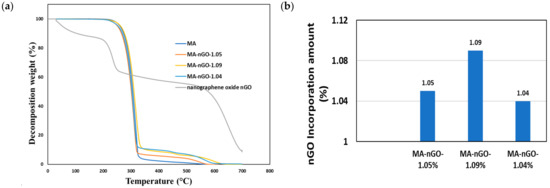 (a) Thermogravimetric analysis (TGA) of drug composites and (b) computed nGO incorporation.