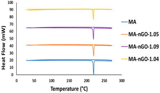 Thermogravimetric analysis (TGA) was used to measure and monitor the decomposition profiles of the nGO composites as well as the pure drug. Figure 8 shows that all the samples decomposed around similar temperatures. No significant variation of structural decomposition was observed up to 700 °C. The analysis suggests that a very stable thermal composite material was produced and could be stable enough in a wide temperature range. Additionally, the incorporated concentrations of nGO for all the composites were also determined by TGA. The analysis of TGA data was carried out using the first derivative of the decomposition profile. The calculated incorporation of nGO for all the composites were found to be around 1.0% (Figure 8b). The data suggest that maximum nGO incorporation during antisolvent precipitation could not be increased further. Figure 9 shows additional thermal analysis data using a differential scanning calorimetry (DSC). This data shows the material’s melting point. The original melting point for pure MA was ~219–220 °C. The prepared MA-nGO showed very similar melting point, suggesting that there was no alteration of the polymorph.