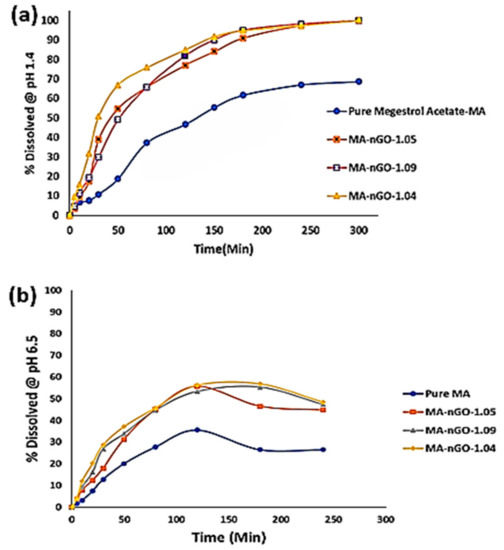 Figure 10a is the dissolution profile for MA and its nGO composites. It is evident from the profile that nGO helped enhance the dissolution rate and aqueous solubility significantly. As can be seen from the graph, there was also a trend of increasing nGO concentration to a certain point, which also increased the dissolution rate. Table 2 shows the enhanced rate and reduced time taken to reach 50% dissolution (T50) and 80% dissolution (T80), respectively. Despite using larger amounts of nGO to incorporate, only ~1% was embedded. The dissolution profiles of the composites were similar but showed improvement in dissolution behavior compared to pure drug. With the incorporation of 1.04% of nGO, T50 and T80 went down from 138.0 min to 27.0 min and did not dissolve for 97.0 min, respectively. Pure MA active ingredients have very low solubility, so with the incorporation of nGO, it was possible to dissolve 100.0% of the ingredients. Similarly, the initial dissolution rate (0 min to 20 min) increased with nGO incorporation; from 14.41 µg/min for pure drug to 60.62 µg/min when the nGO incorporation concentration was 1.04%. The in vitro dissolution study was conducted in a media (0.1 N HCl) that mimicked the gastric pH (pH 1.4). An in vitro study was also carried out in simulated intestinal environment (pH 6.5). The composites showed lower percentages of dissolution and precipitate formation (Figure 10b). Table 3 shows that at the intestine pH, the 50% dissolution average time was around 94 min for the composites, whereas 80% dissolution could not be achieved for any of the composites. The pure MA did not even show 50% dissolution. Additionally, comparable initial (0 min to 20 min) dissolution rate was two- to three-times higher for MA-nGO composites than pure MA. This implies that the MA-nGO composites could potentially dissolve in vivo and enhance absorption.
