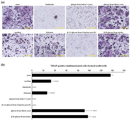 Effect of each of the β-glucans on osteoclast formation of bone marrow cells. Bone marrow cells isolated from the femurs and tibias of 6-week-old male ddY mice were incubated with macrophage colony-stimulating factor (M-CSF; 20 ng/mL) and receptor activator of nuclear factor kappa B ligand (RANKL; 40 ng/mL) in the presence or absence of each β-glucans (50 μg/mL). All the procedures were approved by the Animal Care and Use Committee of Kyushu Dental University. (a) Cells were cultured for four days and stained for tartrate-resistant acid phosphatase (TRAP) activity. Scale bars indicated 500 μm. (b) TRAP-positive multinucleated cells containing three or more nuclei were considered as osteoclasts and were counted using light microscopy. Data are presented as mean ± S.D of three independent samples. *** p < 0.0001 compared with the non-β-glucan treatment group (none).