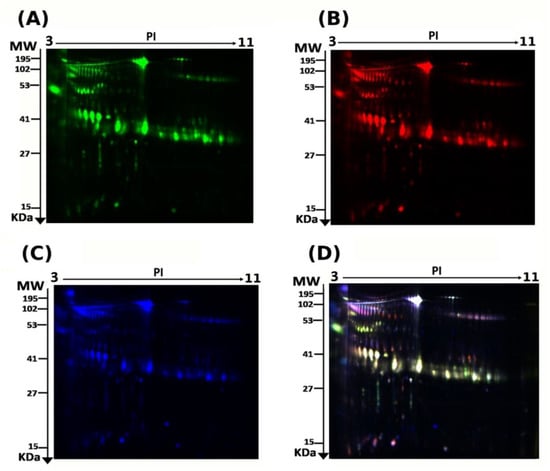 After a standard 10 h fast, midstream spot urine samples (50–100 mL) were collected in a clean-catch specimen into a sterile urine container and immediately transported in ice to avoid microbial contamination and proteolysis. We used urine test strips to screen for urinary protein, urinary infection, urinary sugar, and occult blood (Combur10Test, Roche: Basel, Switzerland). Within 30 min of collection, the samples were processed, and insoluble materials were removed by centrifugation at 2000× g (4000 rpm) at 4 °C for 10 min to avoid protein release from these artifacts. For long-term storage, the supernatants were carefully removed and frozen in 2 mL aliquots at −80 °C. Proteins were extracted from urine samples as previously reported []. Centrifugation (12,000× g, room temperature, 5 min) was used to pellet insoluble material. In a labeling buffer, the pellets were solubilized (7 M urea, 2 M thiourea, 30 mM Tris-HCl, 4% CHAPS, pH 8.5). The 2D-Quant Kit was then used to determine the concentration of protein samples in triplicate (GE Healthcare, Chicago, IL, USA).