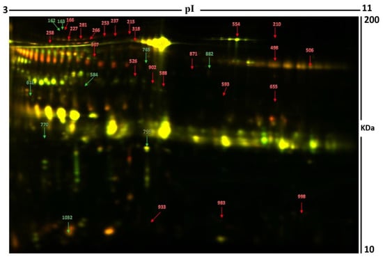 Representative image of the gel depicting the protein spots identified with MALDI-TOF (MS) in the urine samples. Numbered spots indicate proteins that were significantly changed (over 1.5-fold change, p < 0.05) between the hyperthyroid and euthyroid states. The red and green arrows indicate the upregulated and downregulated proteins respectively between the two states.
