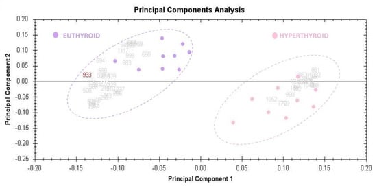 The Progenesis SameSpots software was used to assess and visualize the samples of hyperthyroid and euthyroid subjects using the principal component analysis (PCA). All 40 spots with statistically significant (ANOVA, p < 0.05) changes in abundance determined by MS were subjected to PCA. The tests showed that the two groups clustered differently based on different proteins, with a significant score of 62 percent.