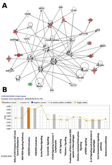 The differentially expressed proteins with their most enriched interaction network in the hyperthyroid state compared with the euthyroid state. Upregulated nodes are red, while downregulated nodes are green. Between the two states, the central nodes of the pathway related to signaling of the ALB, IL4, APP, AKT1, Akt, and IgG were found to be deregulated. IPA proposes uncolored nodes that represent possible targets that were functionally coordinated with the differentially expressed proteins. Direct molecular interactions are indicated by solid lines, while indirect molecular interactions are indicated by dotted lines (A). The top 15 canonical pathways, ranked by p-values obtained via the IPA, are depicted in this diagram (B).