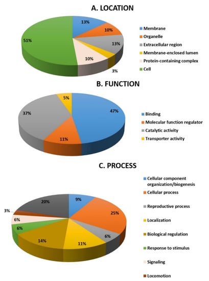 Comparative depiction (%) of the significantly identified proteins using MALDI-TOF (MS): categorized into groups according to their location (A), function (B), and process (C).