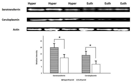 Immunoblot analysis successfully validated key proteins that were differentially abundant between the groups (Figure 6). The proteins targeted for confirmation included: serotransferrin and ceruloplasmin. Immunoblots confirmed a significantly (p ≤ 0.05) different expression of these proteins in hyperthyroid urine samples compared to euthyroid urine samples. The housekeeping protein β-actin was used to normalize the immunoblot results (Figure 6A,B).