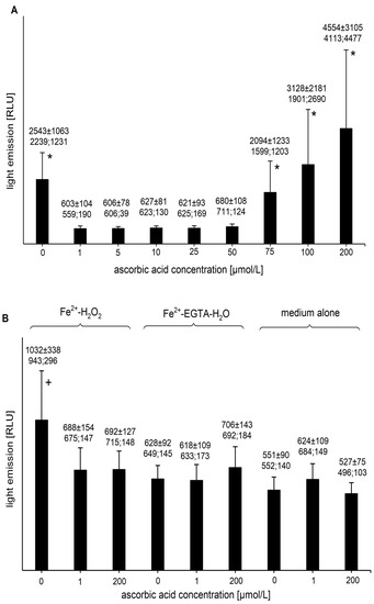 (A)—Effect of ascorbic acid on light emission from 92.6 µmol/L Fe3+—185.2 µmol/L EGTA—2.6 mmol/L H2O2 system (B)—Effect of ascorbic acid on light emission from control systems with 92.6 µmol/L Fe3+—2.6 mmol/L H2O2, 92.6 µmol/L Fe3+—185.2 µmol/L EGTA-H2O, and medium alone with H2O. Total light emission was measured for 2 min just after automatic injection of 100 µL of H2O2 solution or distilled water. Final sample volume: 1080 µL. Results obtained from four series of experiments expressed as mean and standard deviation and (median; interquartile range). * vs. ascorbic acid concentrations of 1, 5, 10, 25, 50, and 75 µmol/L, p < 0.05. † vs. Fe3+-H2O2 with addition of ascorbic acid at concentrations of 1 and 200 µmol/L, Fe3+-EGTA, and medium alone with or without the addition of ascorbic acid at concentrations of 1 and 200 µmol/L, p < 0.05. EGTA—ethylene glycol-bis (β-amino ethyl ether)-N,N,N′,N′-tetra acetic acid, RLU—relative light units.