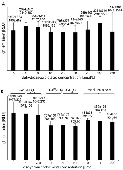 DHAA at concentrations of 1, 5, 10, 25, and 50 µmol/L had no effect on the UPE of the Fe3+-EGTA-H2O2 system (Figure 4A). For the concentrations of 75 and 100 µmol/L, a slight tendency to increase the light emission was noted, while at the DHAA concentration of 200 µmol/L, a tremendous increase in mean UPE (almost 70-times) was found (Figure 4A). DHAA at concentrations of 1 and 200 µmol/L also increased the light emission from Fe3+-H2O2 (p < 0.05) but had no effect on other controls (Fe3+-EGTA or medium alone) (Figure 4B).
