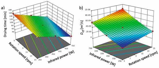 Using infrared drying impact, the drying time is shorter even 47% in comparison to convective drying [24]. Figure 1 shows the curve of the impact level of infrared power and drum rotation speed on the drying time and effective moisture diffusivity (Deff) of terebinth. According to the results in Table 1, it was found that the linear effects of infrared power and rotation speed on the drying time of terebinth are significant (p < 0.05). The drying time of terebinth is strongly influenced by the infrared power (higher coefficient for B: infrared power than A: rotation speed in the equation in Table 1). As the infrared power and the rotation speed increased, the drying time of terebinth decreased (Figure 2a). The reduction in drying time with increasing infrared power may be due to the faster removal of moisture from the product at high infrared powers. This is because increasing the output infrared power increases the temperature in the chamber and the intensity of the infrared rays, which further reduces the moisture content of the terebinth. Thus, the higher the infrared power, the greater the mass and heat transfer, and the greater the reduction in the moisture content of terebinth. This is in agreement with other researchers’ results [23,25,26], which show that the drying time significantly decreases by increasing the infrared power. The drying time is also reduced by increasing the mesh rotation speed. The reduction in the processing time by increasing the rotation speed may be due to the rapid removal of moisture from the product. The reduction in the processing time by increasing the drum rotation speed has been reported for green peas [27], chilies [28], and pistachios [29].