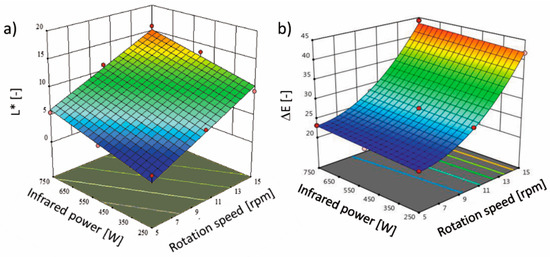 In Table 1, the fitting effect of different levels of infrared power and rotary rotation speed on independent parameters was presented, which will be discussed in the following subchapters. The model’s fitting was evaluated on the basis of the coefficient of determination (R2), adjusted R2, predicted R2 and coefficient of variation (CV). All the R2 values were high (>0.98) for all the responses, which means that the response surface methodology models were suitable. Furthermore, the coefficient of variation for almost all parameters was below 5%, with one exception for lightness (12.6%). Thus, this means that the results demonstrated good accuracy and precision with the reliability of experiments.