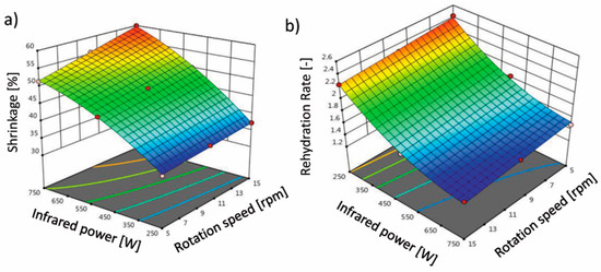 The shorter drying time causes lower shrinkage and better rehydration and hygroscopic properties [24]. According to Table 1, the effect of the variables, rotation speed and infrared power, on the percentage of shrinkage (Sb) was significant (p < 0.05) and quadratic. This trend is evident in the response surface (Figure 3a), confirming the significance of the linear coefficients of the model. It can be noted that the highest Sb was 59.99% at a 750 W power and 5 rpm rotation speed, while the lowest Sb was recorded at a 250 W power and 5 rpm rotation speed. By increasing the rotation speed and infrared power, the percentage of Sb increases. The results of this study are in good agreement with the observations of Ghavidelan and Chayjan [33]. This may be due to the rapid release of water (moisture) from the terebinth tissue with increasing infrared power and rotation speed. In general, heating and moisture removal causes stresses in the cellular structure of the food, resulting in the deformation and reduction in the size of the product. Fruits and vegetables have a high moisture content, and their structure changes due to Sb. During the drying process, water is removed from the cell, the tension that the water exerts on the cell wall is reduced, and this reduction in tension causes the product to shrink [40]. Furthermore, shrinkage is associated with an increase in the density of the sample, which, on the other hand, results in less porosity [11,24]. Ruhanian and Movagharnejad [41] investigated the thin layer drying of potato in a combined infrared–hot air dryer and found that shrinkage of the samples increased with increasing infrared power. They stated that increasing the infrared power increased the amount of heat given to the food. Therefore, greater moisture gradients occur in the samples, resulting in increased internal stress and consequently increased shrinkage.