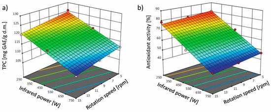 Evaporation of the water causes the material matrix to dry and the concentration of water-soluble substances to increase. The concentration of ingredients may accelerate the course of chemical and enzymatic reactions in the product [43]. According to Table 1, the linear model is suitable for predicting total phenolic compounds (TPC) and antioxidant activity (AA) under the influence of the variables under study (infrared power and rotation speed). The independent effect of infrared power and mesh rotation speed on TPC and AA was significant (p < 0.05). Figure 4 shows the curve of change in the response surface for the TPC (Figure 4a) and AA (Figure 4b) of terebinth after drying. The TPC and AA obtained in this study under different drying conditions ranged from 108.05 to 125.57 mg GAE/g d.m. and from 43.21% to 80.52%, respectively. It is very important to maintain product quality after the drying process. Some factors, such as the drying method (type of dryer, temperature, infrared power, and rotation speed) as well as pretreatments, affect the TPC and AA properties of the dried products [7,18,44]. The TPC and AA decreased with increasing the infrared power from 250 to 750 W and the rotation speed from 5 to 15 rpm. This is because phenolic compounds are very active and have unstable chemical properties. The high infrared power and rotation speed can accelerate the reaction rate of thermal degradation of phenolic compounds, thus reducing TPC and AA [45]. In the dried foods, there is a direct relationship between TPC and AA properties [46]. Therefore, the reduction in TPC also reduces AA.