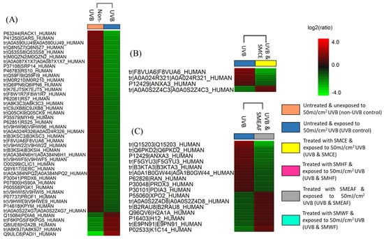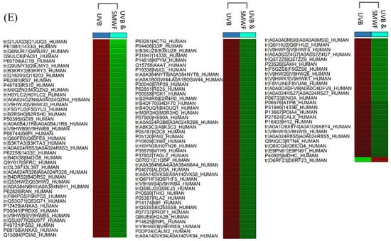Heat maps obtained from Peaks Q displaying the changes in protein expression across controls and samples. The red color signifies the upregulation of protein expression while the green color signifies downregulation of protein expression. (A) The comparison of non-UVB and UVB control cells. (B–E) are the comparison of UVB control cells with cells that were simultaneously exposed to UVB while being treated with SMCE, SMEAF, SMHF, and SMWF, respectively.