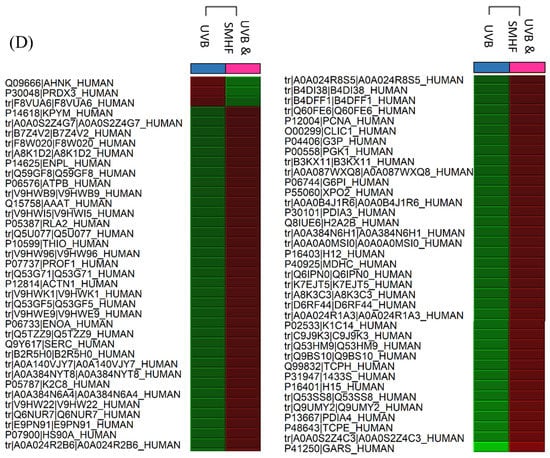 - Wu, C.-L.; Chou, H.-C.; Cheng, C.-S.; Li, J.-M.; Lin, S.-T.; Chen, Y.-W.; Chan, H.-L. Proteomic analysis of UVB-induced protein expression- and redox-dependent changes in skin fibroblasts using lysine- and cysteine-labeling two-dimensional difference gel electrophoresis. J. Proteomics 2012, 75, 1991–2014. [Google Scholar] [CrossRef] [PubMed]