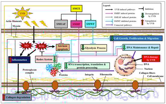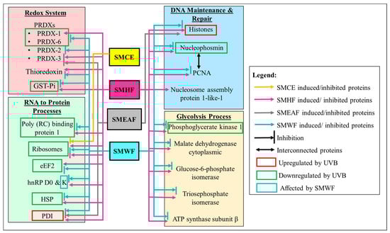 Dysregulation of proteins involved in the redox system, DNA maintenance and repair, RNA transcription to protein synthesis, and glycolysis process by UVB irradiation and the effect SMCE, SMHF, SMEAF, and SMWF has on the UVB irradiated cells.