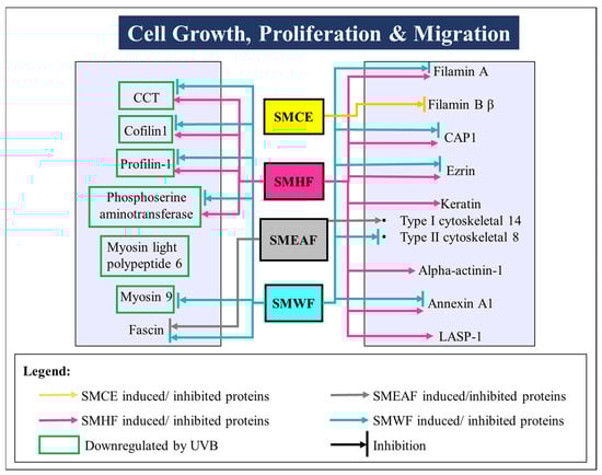 UVB-induced changes in the expression of proteins involved in cell growth, proliferation, and migration processes. These proteins then were either rescued or further suppressed after being treated with SMCE, SMHF, SMEAF, and SMWF.
