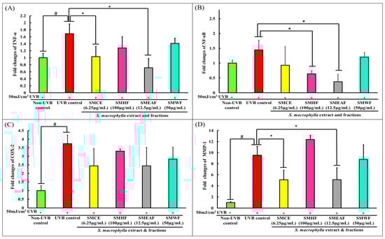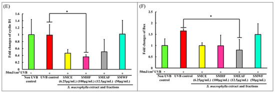 Gene expression changes in HaCaT cells after UVB irradiation and treatment with S. macrophylla extract and fractions. HaCaT cells were treated with SMCE, SMHF, SMEAF, and SMWF (at indicated concentrations) before being irradiated with 50 mJ/cm2 UVB immediately. After irradiation, the extract was removed and the cells were left to incubate for 24 h before mRNA extraction. The fold changes in (A) TNF-α, (B) NF-κB, (C) COX-2, (D) MMP-1 (E) cyclin D1, and (F) Bax mRNA expression were analyzed using qPCR. Data were expressed as mean ± standard deviation. (n ≥ 3; p-value ≤ 0.05; # symbolizes significant difference between non-UVB and UVB control; * symbolizes significant difference between UVB control and sample).