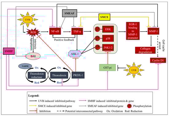 Activation of the redox system, cell inflammation, collagen degradation, cell cycle arrest and intrinsic apoptosis by UVB and the effect SMCE, SMHF, and SMEAF treatment has on the irradiated keratinocyte cells.