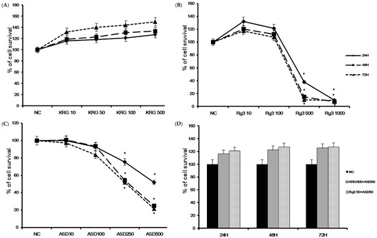 All experiments were performed in triplicate and repeated at least five times with comparable results. Results are presented as mean ± standard deviation. Statistical significance to determine the cytotoxic effects of ASD and KRG or Rg3 was determined using single-factor repeated measure analysis. Student’s t-test was used for comparisons between two groups, while data comparisons between several groups were made using one-way analysis of variance (ANOVA) followed by Turkey’s test (SPSS ver. 21.0; IBM Corp., Armonk, NY, USA). A p-value of 0.05 or less was considered statistically significant.