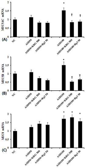 Effects of Korean red ginseng (KRG) and Rg3 on mucin gene expression in bronchial epithelial cells (BEAS-2B). 100 μg/mL Asian sand dust (ASD) significantly enhanced MUC5AC (A), MUC5B (B), and MUC5B (C) mRNA expression in BEAS-2B cells, which was suppressed by Korean red ginseng (KRG) and Rg3. NC; negative control, *; p < 0.05 compared with NC, †; p < 0.05 compared with ASD stimulated group, n = 7.
