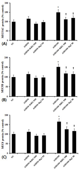 Effects of Korean red ginseng (KRG) and Rg3 on mucin protein expression in bronchial epithelial cells (BEAS-2B). 100 μg/mL Asian sand dust (ASD) significantly enhanced MUC5AC (A), MUC5B (B), and MUC8 (C) protein expression in BEAS-2B cells, which was suppressed by KRG and Rg3. NC; negative control, *; p < 0.05 compared with NC, †; p < 0.05 compared with ASD stimulated group, n = 5.