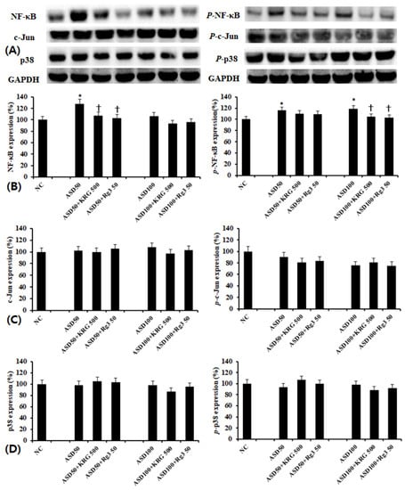 Using western blot analysis, we determined the effect of ASD on NF-κB, AP-1, and MAPK transcription factor expression. We found that while ASD enhanced NF-κB and phosphorylated-NF-κB expressions (Figure 4B), it did not affect AP-1 (Figure 4C) and MAPK (Figure 4D) expression. When cells were pretreated with KRG and RG3, ASD-induced increases in NF-κB and phosphorylated-NF-κB expressions were suppressed (Figure 4B).