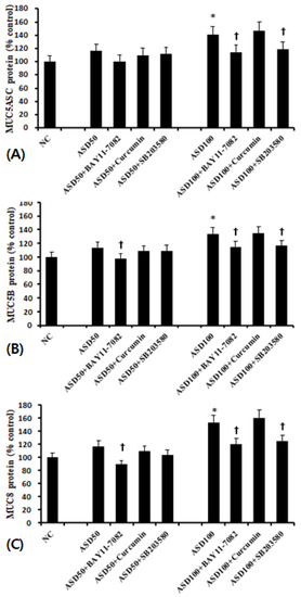 Effects of transcription factor inhibitors on the expression of mucin protein in bronchial epithelial cells (BEAS-2B). ASD-induced MUC5AC (A), MUC5B (B), and MUC8 (C) protein production was significantly inhibited by NF-κB (BAY 11-7082) and p38 MAPK (SB203580) inhibitors. *; p < 0.05 compared with NC, †; p < 0.05 compared with ASD stimulated group, n = 5.